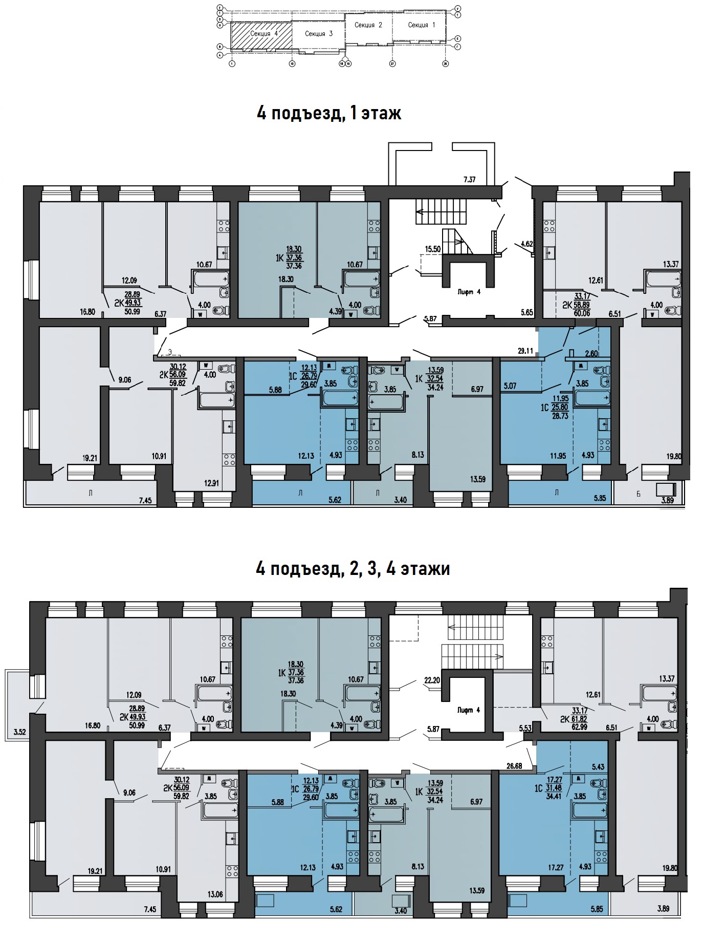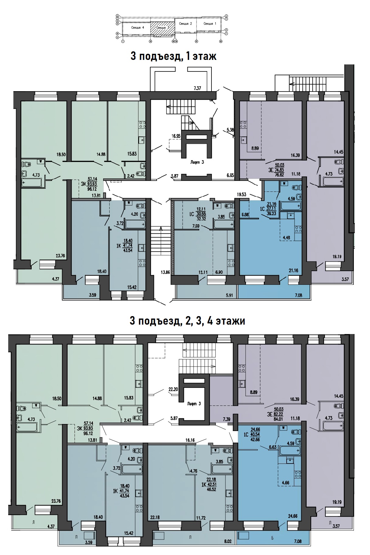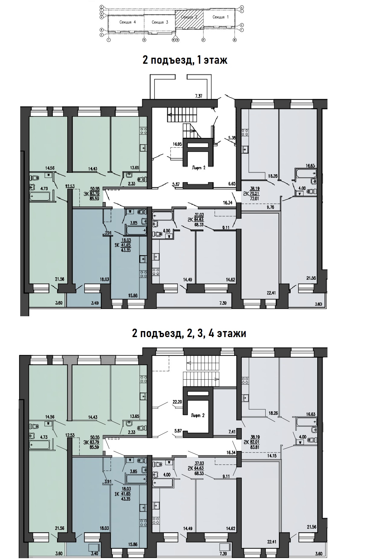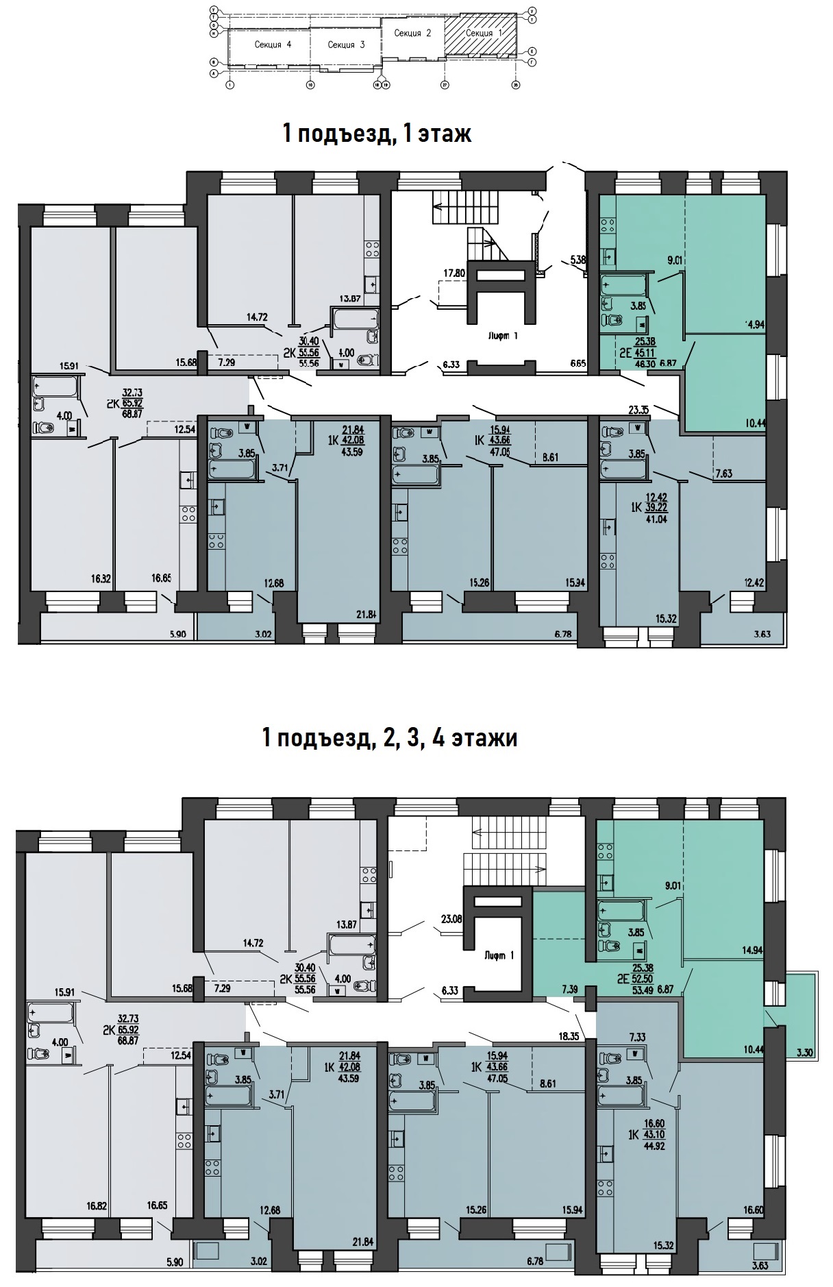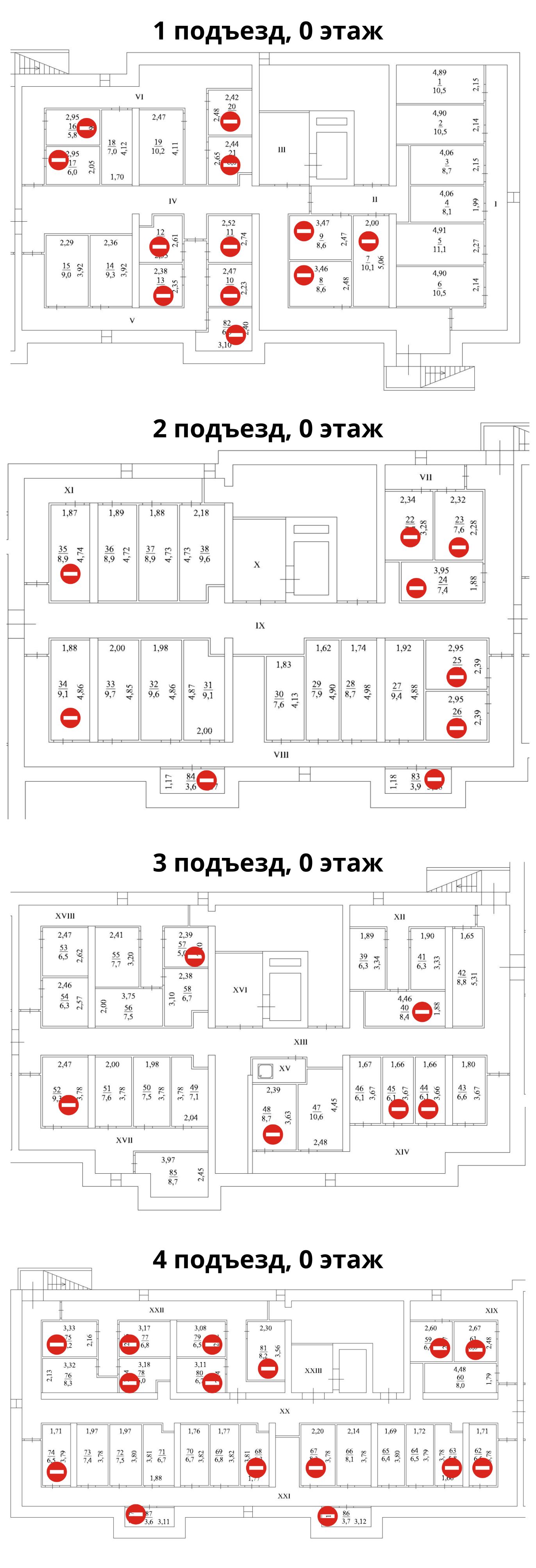• пассажирские лифты спускаются в холл и поднимаются на каждый этаж, в том числе на первый и на -1 этаж, где располагаются кладовые;
